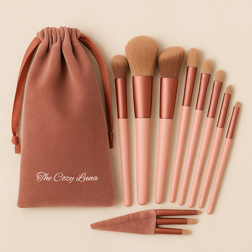 🌙 Complete Set – 13 brushes for every step 💕 Soft Bristles – Gentle, smooth, effortless 🎀 Elegant Design – Luxe rose-gold handles 👜 Velvet Pouch – Perfect at home or on-the-go